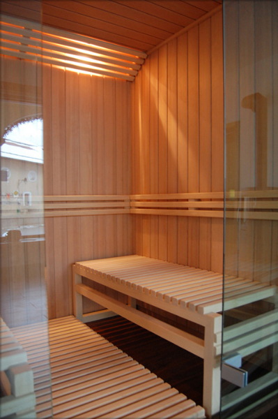 Die Innenverkleidung besteht aus erlesenen Hemlock Profilen und die Außenverkleidung kann nach Holzart variiert werden. Die Vorderwand ist aus 10 mm Einscheibensicherheitsglas mit Tür. Die unter der Innenverkleidung eingebauten Flächenheizelemente bestehen aus einem metallischen Heizleiter, der zwischen zwei hochwertige Mehrschicht-Kunststofffolien eingeschweißt ist.